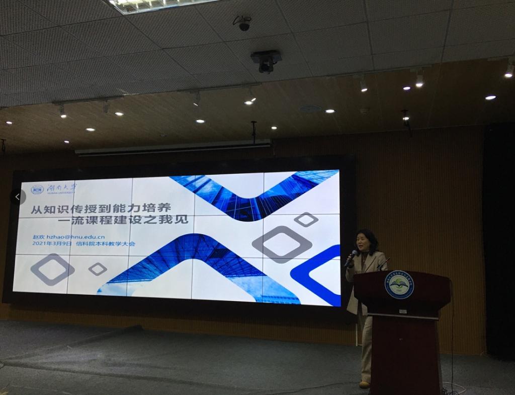 教务处副处长、首批国家级一流课程负责人赵欢应邀作题为《从知识传授到能力培养:一流课程建设之我见》专题报告,解读一流课程的内涵,分享她所带领的《计算机系统》课程组建设国家级一流课程的经验和思考,介绍“以学生为中心”提升“两性一度”、课堂教学高阶化、教学手段多样化、教学载体信息化、实践体系创新化等课程建设特色并对一流课程申报材料进行全流程、多维度讲解。她建议各课程要早做布局,对标国家级一流课程建设标准,精准施策,完善过程材料归档。