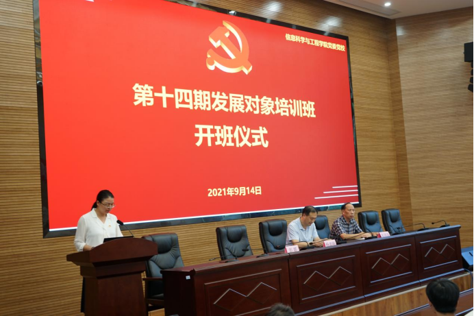 第14期发展对象培训班开班仪式在信息院201报告厅举行。学院党委书记杨忠旺老师、党委副书记彭娜老师、副处级组织员张国田老师、学生党建兼干张雅静老师出席仪式。开班仪式由彭娜老师主持。