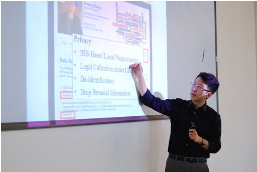 蒋洪波教授主持,美国罗格斯大学张德升博士做了题为 “Cyber-Physical System for Smart Cities: a Mobility Perspective”的精彩学术报告。该报告全面介绍了张德升博士课题组从移动计算的角度开展的一系列智慧城市CPS(Cyber-Physical Systems)研究工作,吸引了学院众多相关领域的老师和研究生参会。