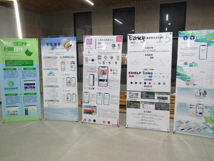 的学生UI设计作品在院楼二楼玻璃展房中展出。展出的学生作品在内容上大致可以分为社交电商、在线学习和师生互动三大类。每一个作品在展板上都详细地介绍了自己的LOGO设计寓意、页面设计理念、功能实现途径和色彩搭配原则,不仅在对比中表现了自己的独特之处,而且给予了参展同学深刻的启发。