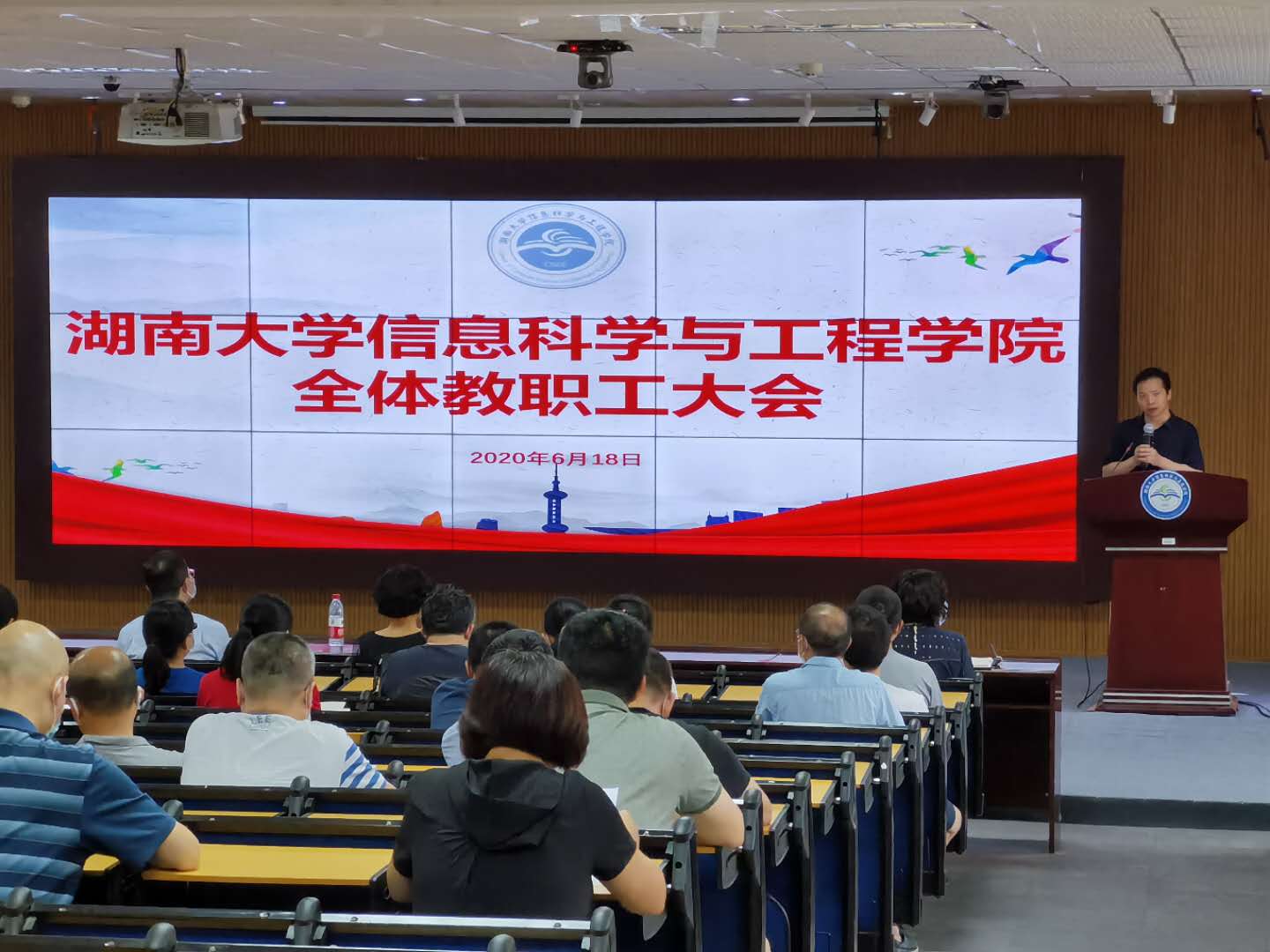 李肯立院长代表学院新任行政班子表态,他在发言中衷心感谢校党委的信任和学院干部师生的支持,深深感到这份信任和重托源于广大师生对学院未来发展的期盼。他认为信息科学与工程学院在前任班子,特别是李仁发同志的领导下已积淀了丰富的文化底蕴,取得了不错的成绩,我们要在学科建设中继续努力,争取在已经打下的坚实基础上有新的突破,取得更好的成绩。李肯立院长指出,新一届学院行政班子成员要把责任扛在肩上,做到用心、用力、用齐和廉洁自律;要对学院工作运行情况进行深入的了解,既问计于教职工,也要问计于学生;要适应新常态,迈向新目标;结合学校“双一流”建设,积极推进学院一流学科建设,在“十四五”期间努力谋求新的发展,促进学院各项事业有更好的提升。