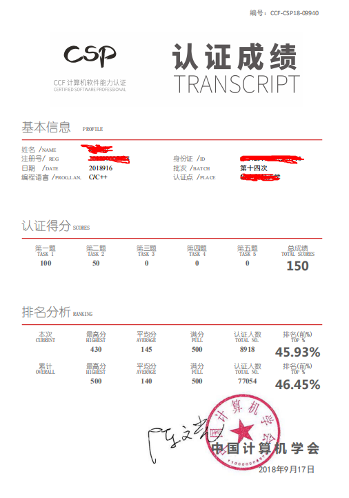 CSP认证成绩单请到CSP认证官网直接下载,模板见下。