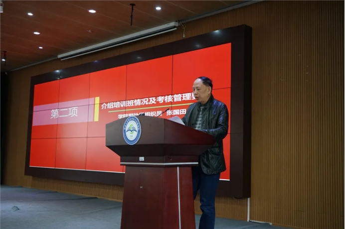 开班仪式第一项,全体成员起立并奏唱国歌。礼毕后,由张国田老师介绍培训班情况及考核管理要求。