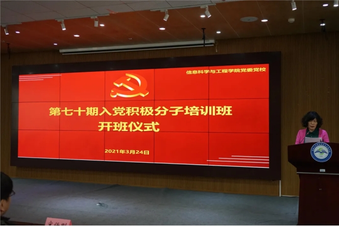 分党校第70期入党积极分子培训班开班仪式于信息院401报告厅举行。学院党委书记杨忠旺老师、党委副书记、纪委书记骆嘉伟老师、副处级组织员张国田老师、学工办主任、组织干事宋任刚老师、学生党建兼干张雅静老师出席仪式。仪式由骆嘉伟老师主持。