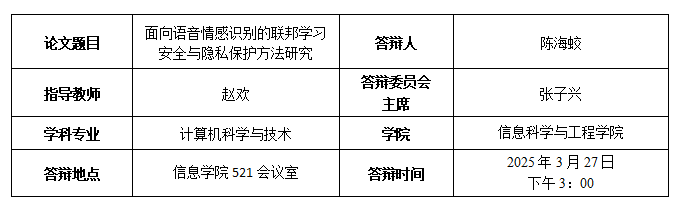 Huan Zhao, Haijiao Chen*, Yufeng Xiao, and Zixing Zhang, “Privacy-enhanced federated learning against attribute inference attack for speech emotion recognition,” in Proc. IEEE International Conference on Acoustics, Speech and Signal Processing (ICASSP), 2023, pp. 1-5. (EI,CCF-B类,导师一作)